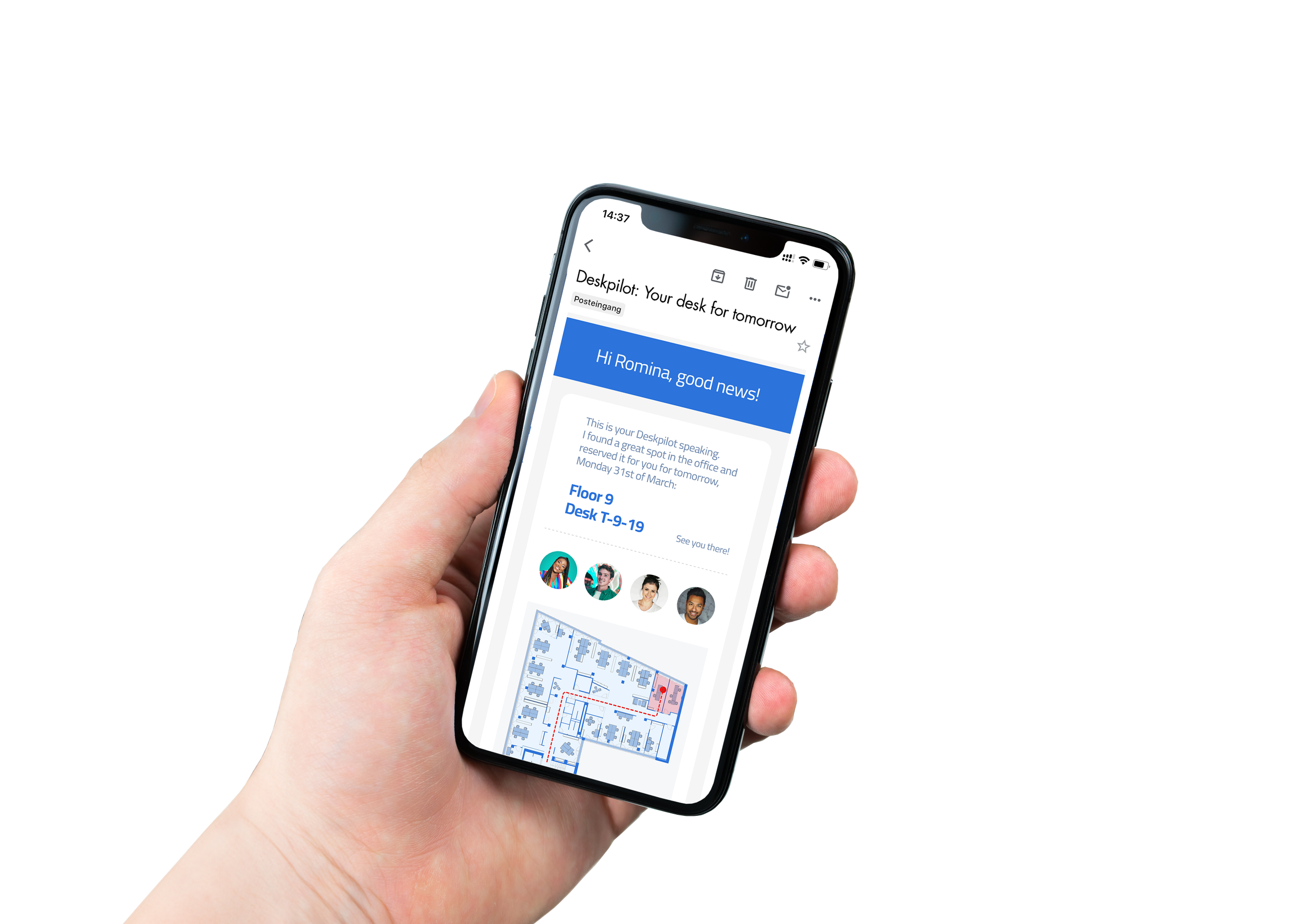 After a short demo Deskpilot OS sends out infomails to all users with a link to their platform, where they can fill their personal survey and plan their attendances.